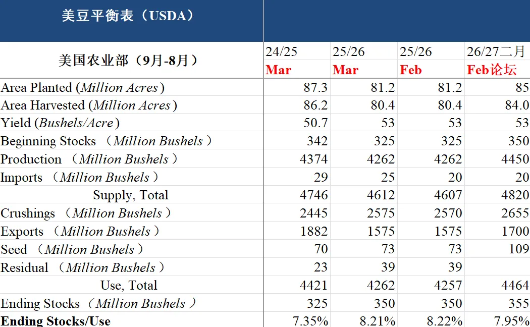 USDA公布三月供需数据,数据偏中性。本次报告中,美豆25/26年度平衡表中,进口由0.2亿蒲上调至0.25亿蒲,压榨由25.7亿蒲上调至25.75亿蒲,结转库存维持3.5亿蒲不变。南美方面,巴西25/26年度平衡表未作任何调整。阿根廷产量由4850万吨下调至4800万吨。本次报告数据影响偏中性,但由于地缘事件导致的市场情绪好转,CBOT大豆仍然维持强势。