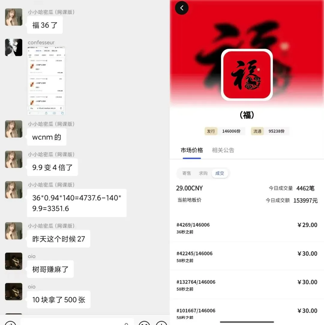 *合成《马上春风来送福》成本约 70 元,开盘即 120 元退市,后续持仓活动推动成本 210 元藏品涨至 500 元,本体仍维持退市态势。