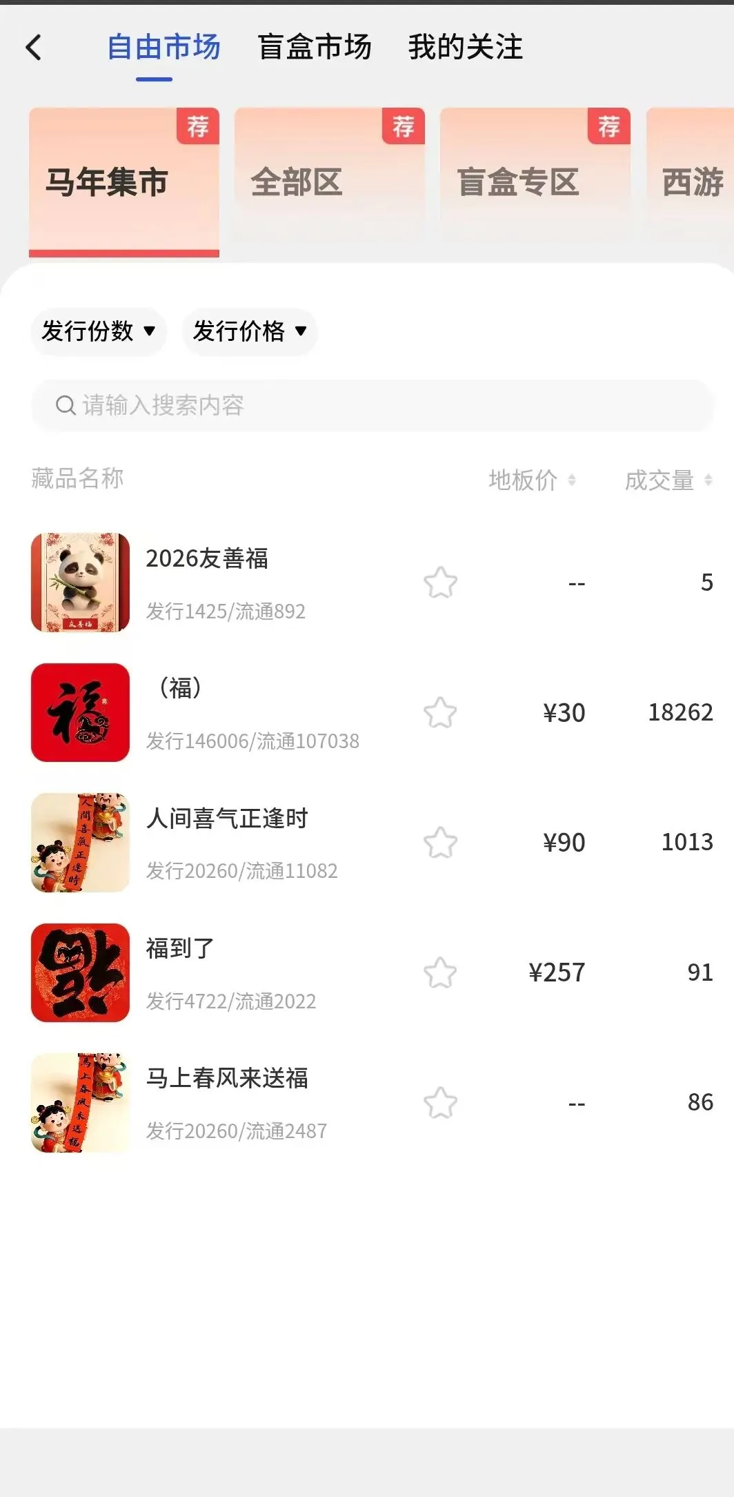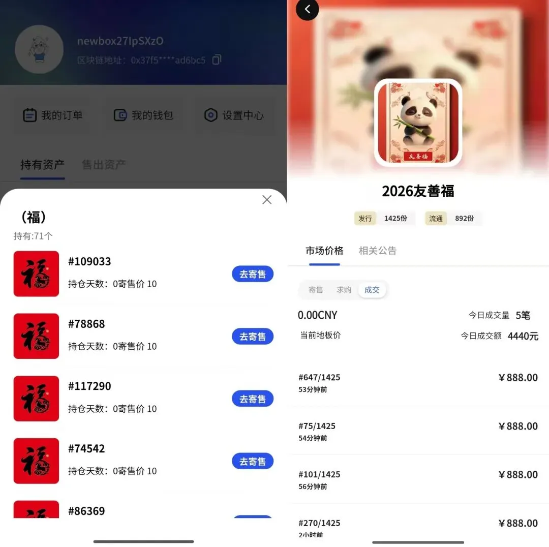 *持仓 100 张(彼时成交价 16-20 元)可额外获得《2026友善福》,该藏品已 888 元退市,叠加《(福)》当前价格,整体利润空间可观。