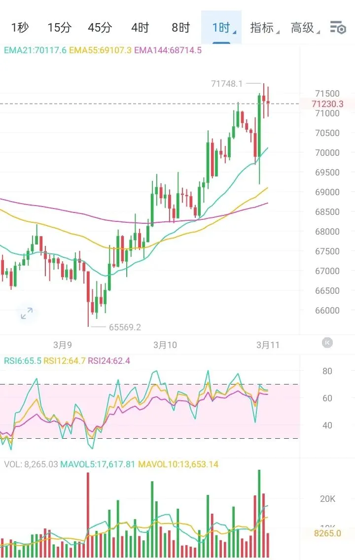 目前大饼已站稳71200美元附近,短线只需重点关注70800-71000美元区域的支撑情况。只要该区域能有效守住,市场整理后有望继续向上测试前高,操作思路上可考虑以回调做多为主。