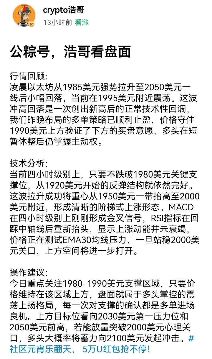从4小时结构来看,昨晚的快速下探更像是突破前的洗盘行为,回踩并未破坏反弹趋势,反而构筑了一个更高的低点,随后放量拉升也确认了短期调整的结束。作为联动指标的以太坊也同步从2007美元企稳回升,市场整体情绪得到支撑。