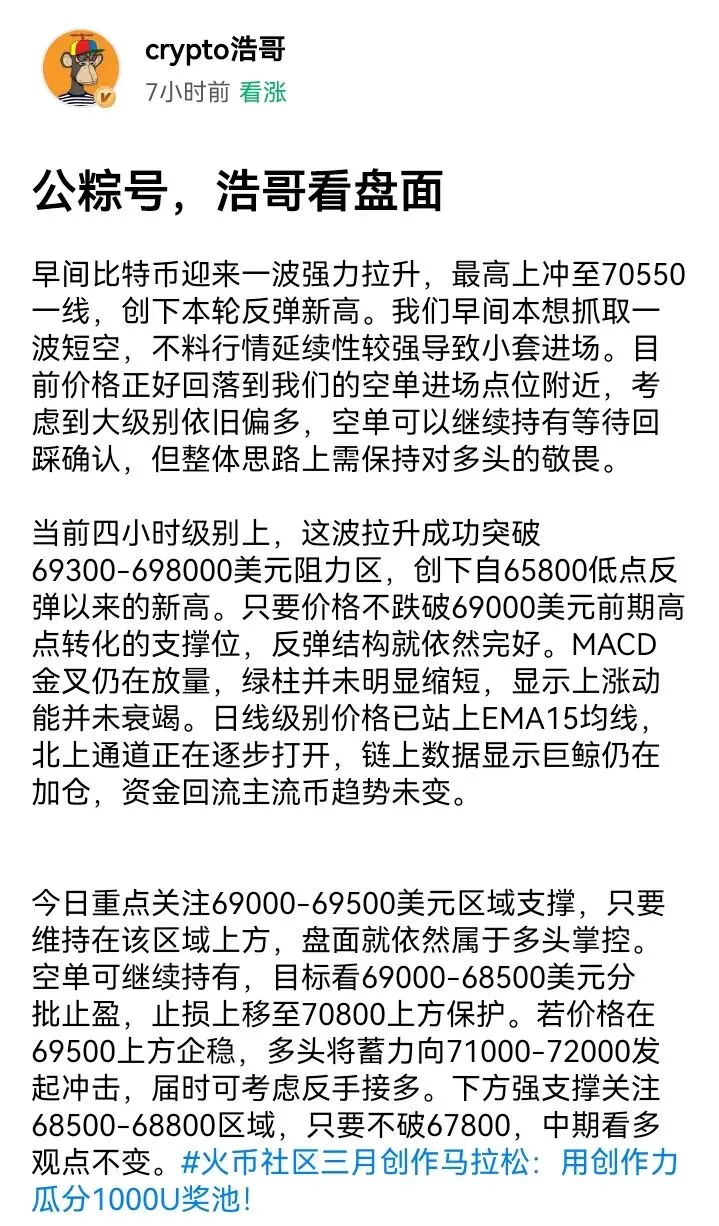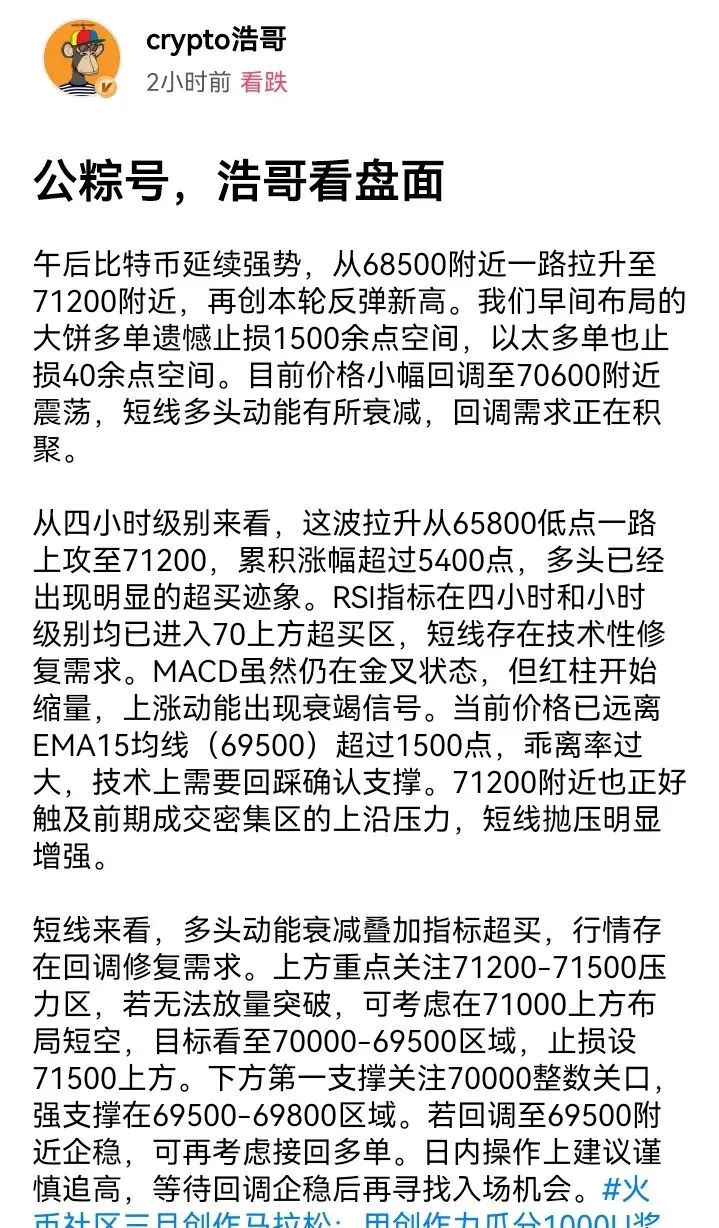 昨晚美股开盘后,大饼在回踩69400美元确认下方支撑后迅速拉起,最高触及71700美元,日线图上留下一根长下影线,这通常意味着下方买盘力量强劲。同时,价格已有效突破前期多次测试的70800-71000美元阻力区,为后续进一步上攻打开了空间。