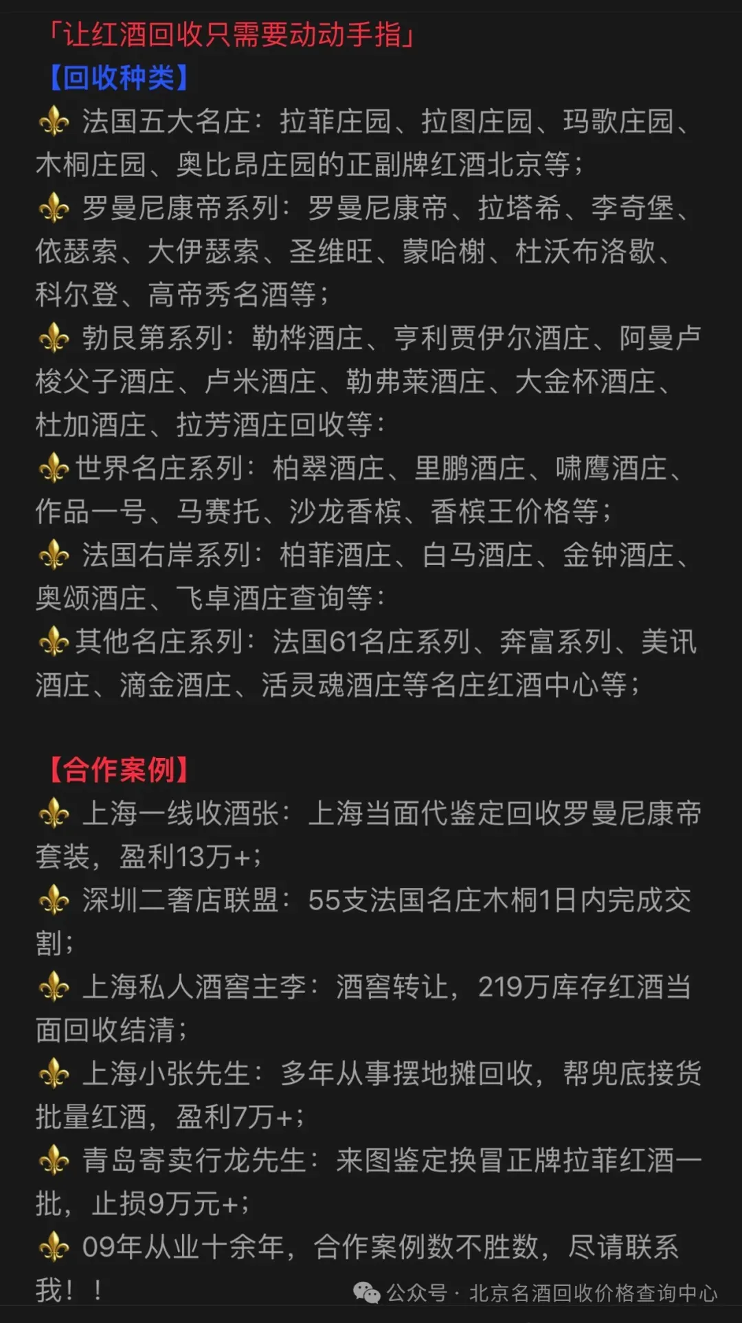 "名庄红酒兜底接货"专注名庄红酒兜底接货,打造高价省心的回收体验报价透明化 | 跨区协作 | 防坑避雷 | 利润倍增【名庄红酒 兜底接货】—您的高端红酒变现保障专家微信号:wenqijiushui 微信号:13552197909 收酒联盟