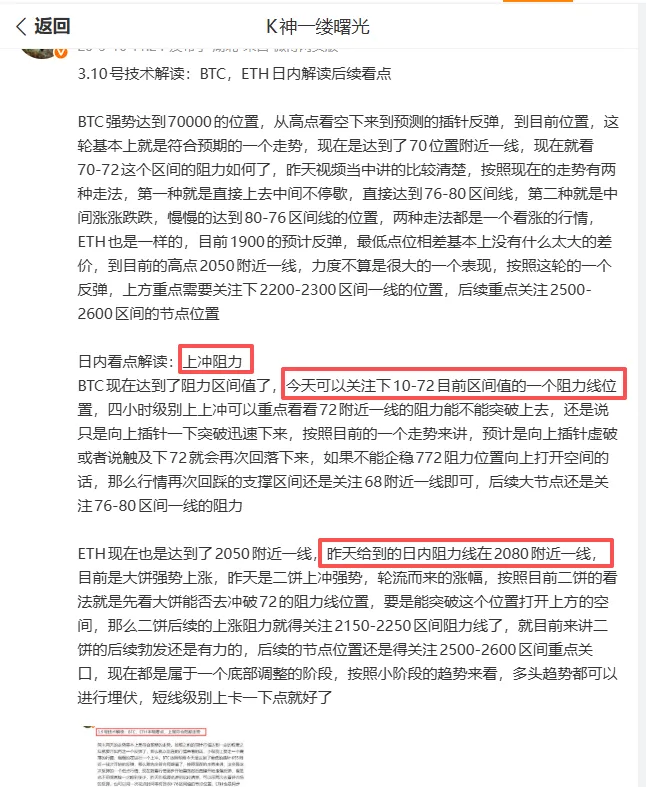 BTC昨天的走势也是很搞人的,走了一天的上冲阻力位置,在晚间的时候四小时级别上收针上冲直接逼近72000的阻力位置,做了一波插针反冲,但还是没有冲破72000位置,只是逼近这个阻力位置附近再次进行回调,那么日内四小时级别上这种走势没有上冲成功,回调就变成了正常的一个行情,今天就可以继续看回踩的力度了,正常目前的支撑就是在68左右一线的支撑位置,ETH也是一样的日内级别上冲了一下2080回踩2000位置再收针反冲了2080,力度上也没有很强,大饼没有去破位的情况,二饼自然就没有那么的强势跟着上冲了,日内级别上还是注意1950附近的支撑,所以日内回踩的力度对于现在来看要重点关注下