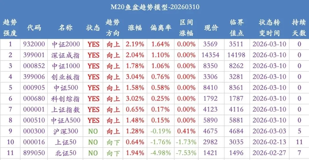 3、腾讯今天暴涨7%,率领恒生互联网止跌。新一轮的资本叙事是腾讯要在微信里植入龙虾ai,让微信用户通过聊天的形式给龙虾布置任务,再让龙虾调用微信生态的小程序来满足用户需求。你别说这个愿景想象一下还挺有竞争力的,既降低了用户使用ai的门槛,还盘活了小程序生态,使得微信的护城河更加深厚。4、交通部约谈了马士基和地中海航运公司。因为巴拿马政府抢了长和的港口,自己又不会运营,就想让马士基或者地中海航运公司来代为运营。中国政府出面约谈这两家公司的目的很容易就能猜到,估计是让他们识相点,别掺合这事,否则有他们好果子吃。5、港股minimax最近涨疯了,1月份ipo的时候价格119,现在已经1200了,这公司的主营就是生产ai模型并提供算力,眼下也是龙虾ai热门的外接大脑。踩点踩的太精准了,公司老板闫俊杰持股25%,已经快身价千亿了,而minimax这个公司是2021年才成立的。1、今天指数大涨,大多数指数一举站上M20并且拐头向上,表明短期趋势向好,但是外围局势并未彻底好转,战争还在继续,先观察几天,才能确定是否开启一波新行情,短期依然看震荡,卧倒不动,坐等指数抬升就好。第三波主升浪的特点是“鸡犬升天”,网格里还剩下这点老登股有望在这波行情里逐渐卖出,一起见证吧。