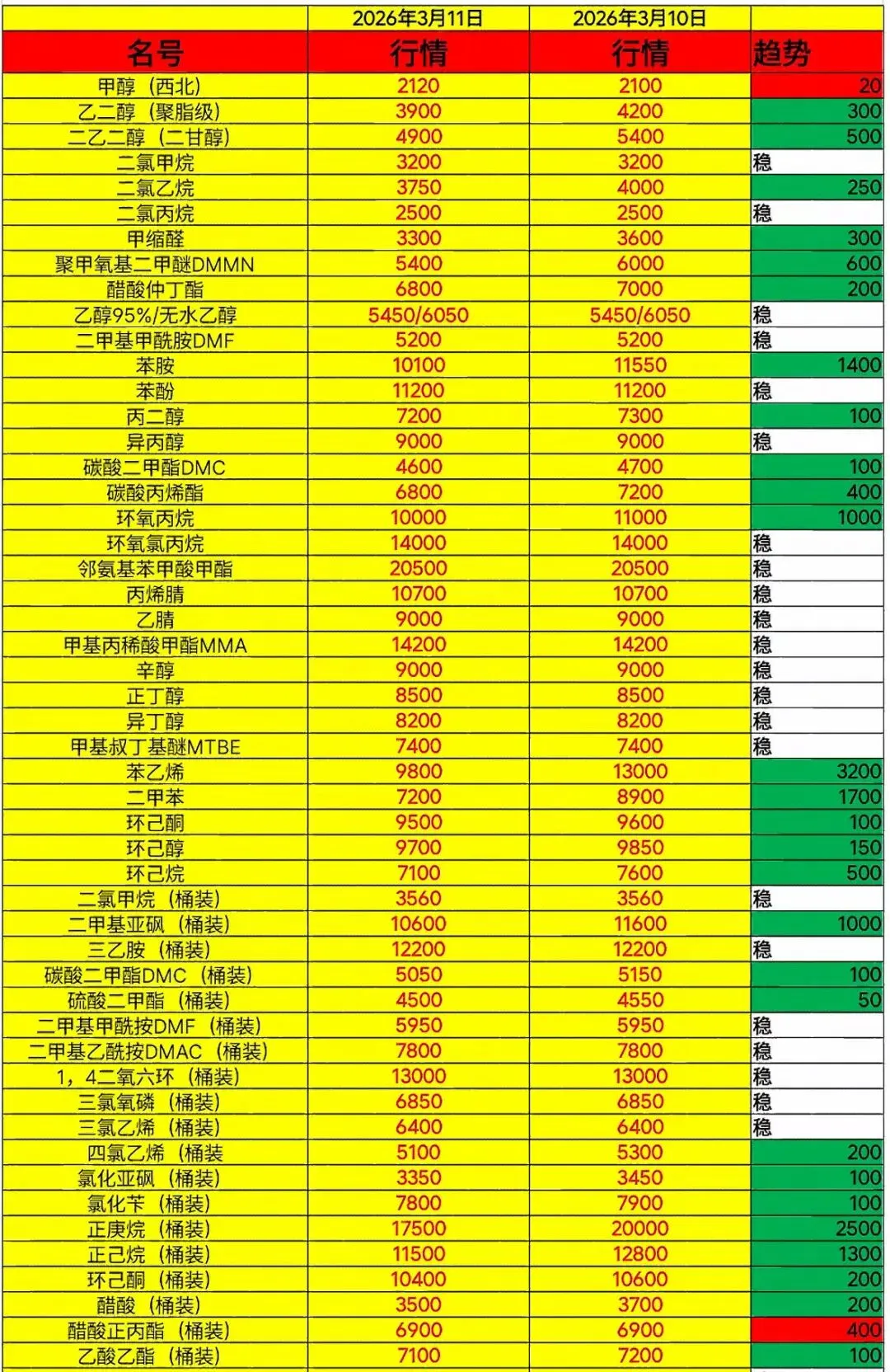 这是一份详细的2026年3月11日化工溶剂市场行情表。通过对比3月10日的价格,市场整体呈现“涨跌互现”的格局,部分产品价格波动较大。