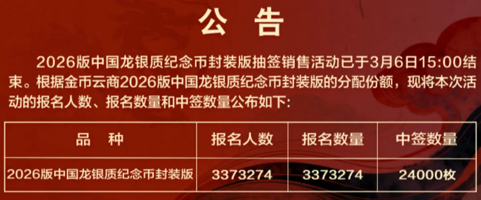 2026版中国龙银币封装版,超过337万人疯抢,中签率低至0.7%!