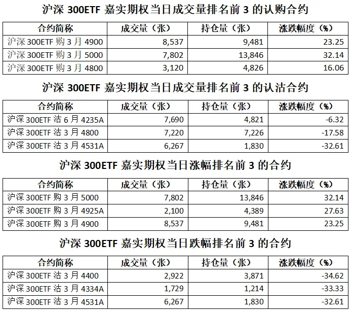 沪深300ETF嘉实期权总成交面额47.83亿元,减少38.44%,期现成交比为0.01,权利金成交额0.36亿元;期权总成交量99,128张,减少39.14%,其中认购期权成交量40,799张,认沽期权成交量58,329张,认沽认购成交比率为1.43(上一交易日认沽认购成交比率为1.95)。