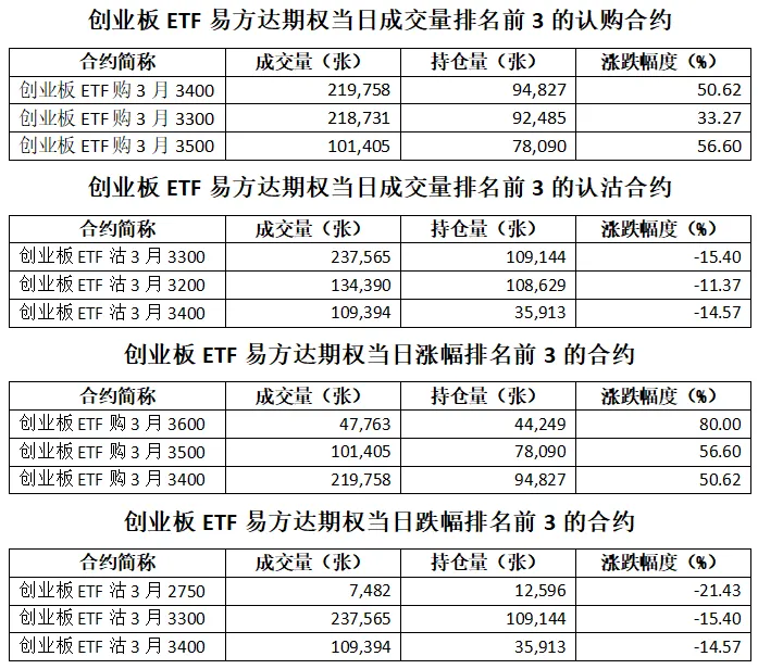 创业板ETF易方达期权总成交面额620.60亿元,增加29.03%,期现成交比为0.26,权利金成交额10.03亿元;期权总成交量1,925,549张,增加26.91%,其中认购期权成交量955,581张,认沽期权成交量969,968张,认沽认购成交比率为1.02(上一交易日认沽认购成交比率为1.22)。