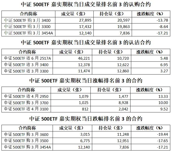 中证500ETF嘉实期权总成交面额72.55亿元,减少20.60%,期现成交比为0.01,权利金成交额1.13亿元;期权总成交量230,086张,减少20.23%,其中认购期权成交量107,585张,认沽期权成交量122,501张,认沽认购成交比率为1.14(上一交易日认沽认购成交比率为1.26)。