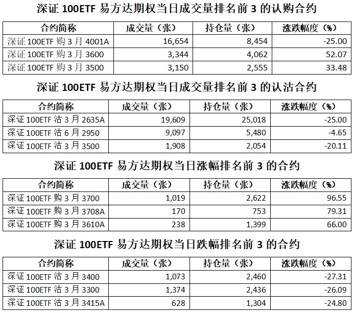 深证100ETF易方达期权总成交面额23.42亿元,增加51.55%,期现成交比为0.01,权利金成交额0.14亿元;期权总成交量70,079张,增加47.48%,其中认购期权成交量29,849张,认沽期权成交量40,230张,认沽认购成交比率为1.35(上一交易日认沽认购成交比率为1.97)。