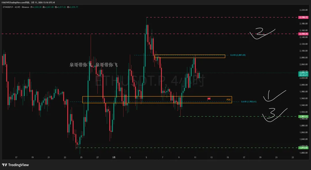 ETH 终于触及阻力+0.618(2087)出现下跌,注意新的0.618+poc区域(1950)。如果你有做到空,恭喜(上方黄色格子已经不能参考了)。ETH走势和BTC很像,就看是否能再出新低(跌破2006),看到更低的价位。