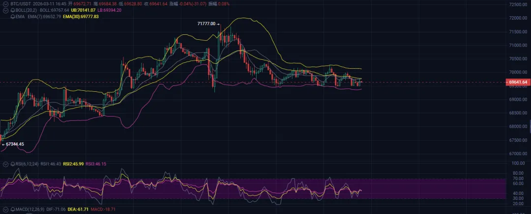 现在的盘面,大饼这个位置有点敏感。今天重点盯着70300这个位置,如果1-2小时级别收不上去,那多头就真的弱了,大概率还要继续磨底或者往下走。手上没空单的兄弟就别急着追了,等反弹到压力位再考虑,比如70300附近,激进的可以轻仓试试,止损就放昨晚的高点,稳一点的话还是等压力位附近再进。