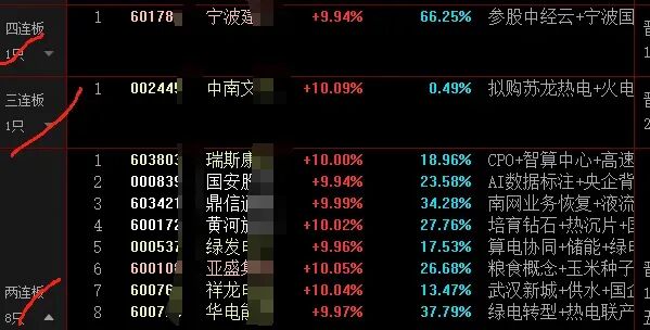 情绪回暖极致分化, 三大指数全天高开高走,两市全天成交2.51万亿元,较上一日放量成交1105亿元,下跌个股超3200只 , 出现 沪弱深强,赛道与成长双线轮动 。站稳4124一线,挑战大阴二一位4156的压制,突破行情看高一线。昨日市场情绪冲高后,今日进入良性分化阶段,整体情绪延续回暖趋势,资金从高位 的 科技 板块向成长 ( 光伏、电池 ) 与赛道 ( 化工 ) 方向有序切换,盘面呈现沪弱深强、机构抱团走强、投机情绪降温的鲜明特征。指数层面,沪指震荡、深成指与创业板指强势领涨,资金明显向深市成长赛道倾斜,权重与题材分化加剧,市场呈现“指数稳、结构强、个股分化”的格局。老龙头,豫能今天反包,趋势依然在,只要没有监管,仍然有持续预期。 顺纳昨天高量,今天竞价抢筹被砸,收盘放量假阴,明天有反包预期。 中军xd的调整也是预期内的,这里调整后, 看缺口支撑力度 ,就会有 选择 。 今天首板的电力值得重视, ( 绿发dl 2连板,中国nj , 赣能gf、节能fd、绿发dl、风范gf) 涨停 , 中国dj 、韶能gf 跟涨。 是有可能出现电力补涨龙的。算力今天调整。板块今天的常规走法就是冲高回落,明天低开调整,就会形成新的买点。 宁波jg今天放天量烂板,明天4进5有难度,中军能建创历史新高超预期, 华工涨幅已经超过50点,光迅也来到20+点。不适合大家现在去追涨了。科技线CPO强势领涨 :算力硬件方向持续爆发,光模块、高速通信等细分板块 连续3天大涨有 承接资金,成为科技成长主线,板块内龙头标的持续走强, 沃格gd 、 瑞斯kd、 天邑gf 多股涨停 , 赚钱效应集中 , 但前排的长飞gx、汇率st、光迅kj今天开始分化,注意观察 。- 新能源赛道全面接力:光伏、储能、电池全线爆发,早盘成为市场核心方向,储能、逆变器等细分方向领涨正泰dy反包涨停, 20cm首航xn涨停带动板块强势拉升,国晟kj、德业gf、三孚gf涨停 。 板块走趋势继续跟踪。 午后光伏板块出现冲高回落,资金获利了结,板块内部开始分化。