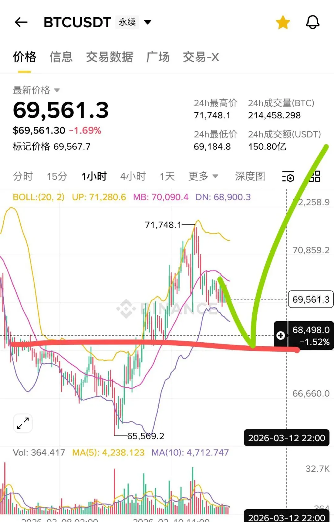 69212 被反复测试,跌破概率偏大,无健康回踩的上涨很危险。