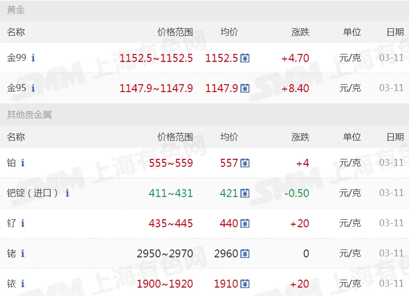 >20260311金银铜铝价格行情