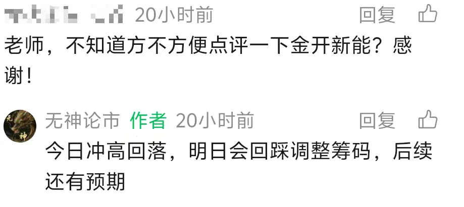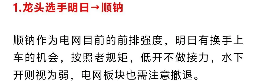 但无神在这的分析复盘,就是为了让同学们快人一步理解市场的浪潮,你不需要超过所有人,咱们就只需要比没看无神哥写的文章的人快一步就好了。昨日同学提问金开新能,无神这边也是直言后续还有预期,毕竟它也是无神上周就提及的算电板块的核心票。而它的好兄弟协鑫能科今日走了一个反包修复的板,但奈何午后资金被化工油气所虹吸,即便后面化工疲软,但回封也没能成功。所以后面无神在板块分析的时候就尽量从简,讲讲基本逻辑就好了。电网、电力、算力、算电等这边是科技线咱们算板块a。a、b板块这边往往是跷跷板的行情,一边回流的时候,另一边就会迎来分歧。总的来说其实目前量能也基本支撑两边一起冲,但是只会顾头不顾尾,只能拉住两边板块的前排,后排还是比较难以形成一致。今天算电方向的中电早盘挺强势的,中电强势冲高,但回落之后不一定能站稳五日线,今日往后没有买点了。这个方向核心票蛮多的,绿发电力、中国能建、协鑫能科、金开新能、豫能控股等,回踩也可以考虑低吸。算力方向则是继续做好咱们等华胜就行了,前排的宁波建工今天爆量分歧晋级四板,明天只有缩量才有晋级机会,成为市场最高板。拓维目前的k线不是特别好看,主动性也没有华胜强,认准华胜大哥就ok。电力也是继续做好咱们手里的华银,今日赣能成功上板,华电能源强势晋级二板,韶能和华电辽能也调整站稳五日线,蓄势待发。除了咱们手里的华银、协鑫集成、华胜没有破五日线,咱们可以接着做,这边无神提点几个新方向。脑机方向资金已有明确异动,同学们可以在平台处找低位低吸。先恭喜在华胜、协鑫的同学,无神这几天反复提示车上做t,这几日应该收获颇丰。但同时昨日的评论区也有个同学问出让无神都无语的问题,说没看见无神说的顺钠在哪里。这真让无神担心,这位同学要是离开了咱们这个大花园,不得在市场上不得被揍成韭菜。无神当时周日晚上的文章顺钠放在第一个讲,这么名牌提示的龙头接力机会,买点都说了,接力不能开太低。周一晋级成功,周二板砸是不是明晃晃的15cm大肉。这里是无神,永远的核心龙头拥护者!永远的趋势牛股追随者!先来的同学们可以在评论区打卡留言,有什么问题无神也会解答。最后记得设置星标,这样同学们就能第一时间收到推送,over免责声明:江苏天鼎证券投资咨询有限公司的[周 培],其证券执业编号为[A1150621120002],本评论观点仅供参考,文中所提及个股均为点评与描述,不作为推荐,更不构成任何投资决策的直接依据。投资者如依据本评论进行操作,需自行承担由此产生的全部风险和责任。股市有风险,入市需谨慎。