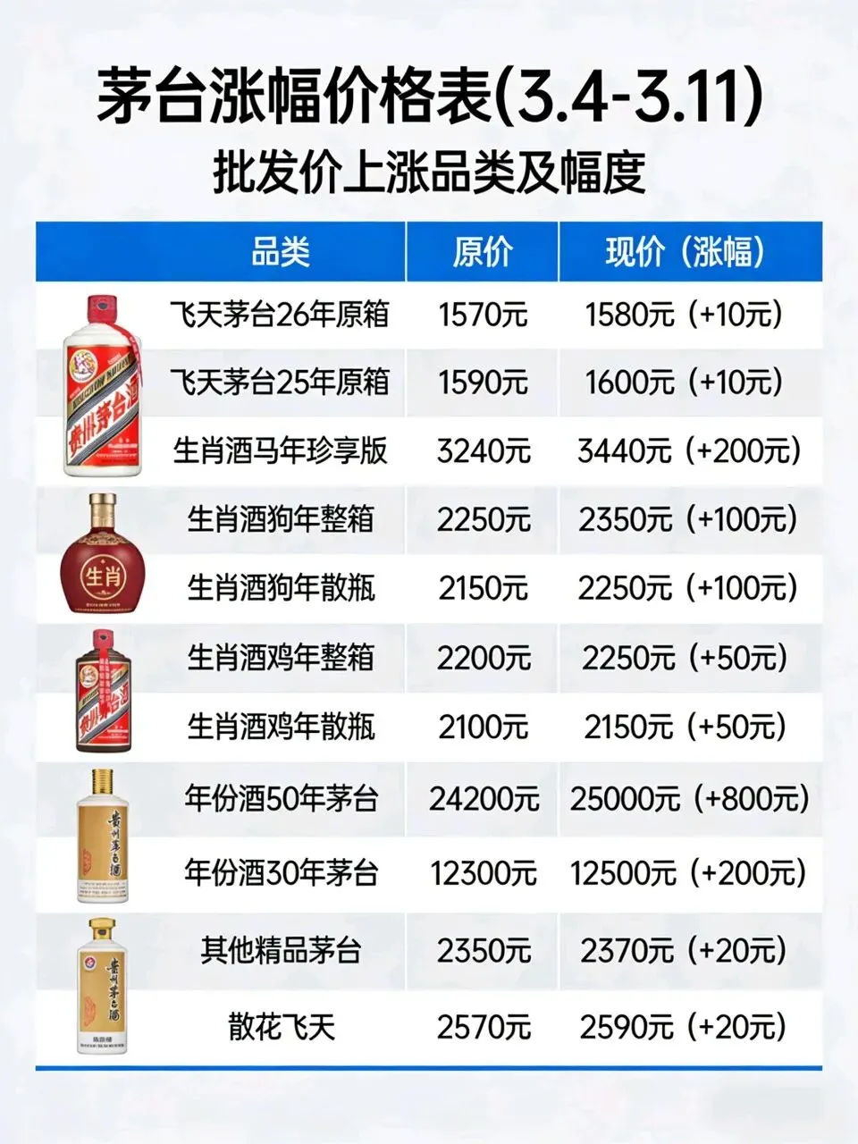 - 培训:茅台镇3月21–22日举办国家品酒师认证(茅台学院考点)飞天、生肖、年份酒近一周(3.4-3.11)价格走势速览,以3月11日批发价为准,数据波动在10元内属正常调整。