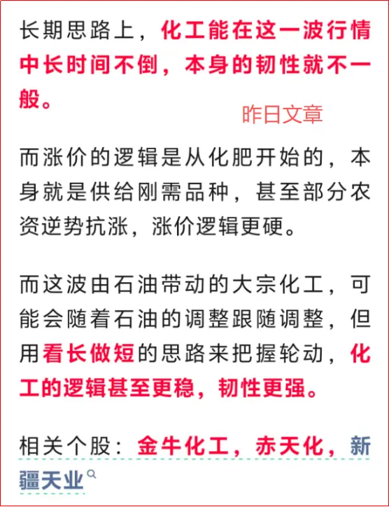 昨天的光纤概念,今天的化工,用看长做短的思路,都是刚好踩在点上,这就是节奏。