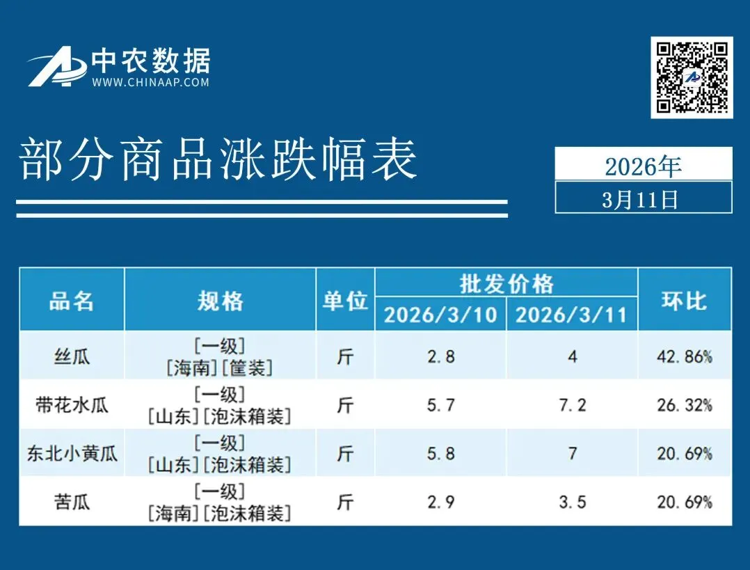 在此背景下,部分瓜类蔬菜的批发价格出现明显上涨。其中,以丝瓜的批发价格涨幅尤为突出,由昨日2.8元/斤攀升至4元/斤,环比涨幅达42.86%;带花水瓜、东北小黄瓜、苦瓜批发价格均上涨超1元/斤,环比涨幅均超20%。
