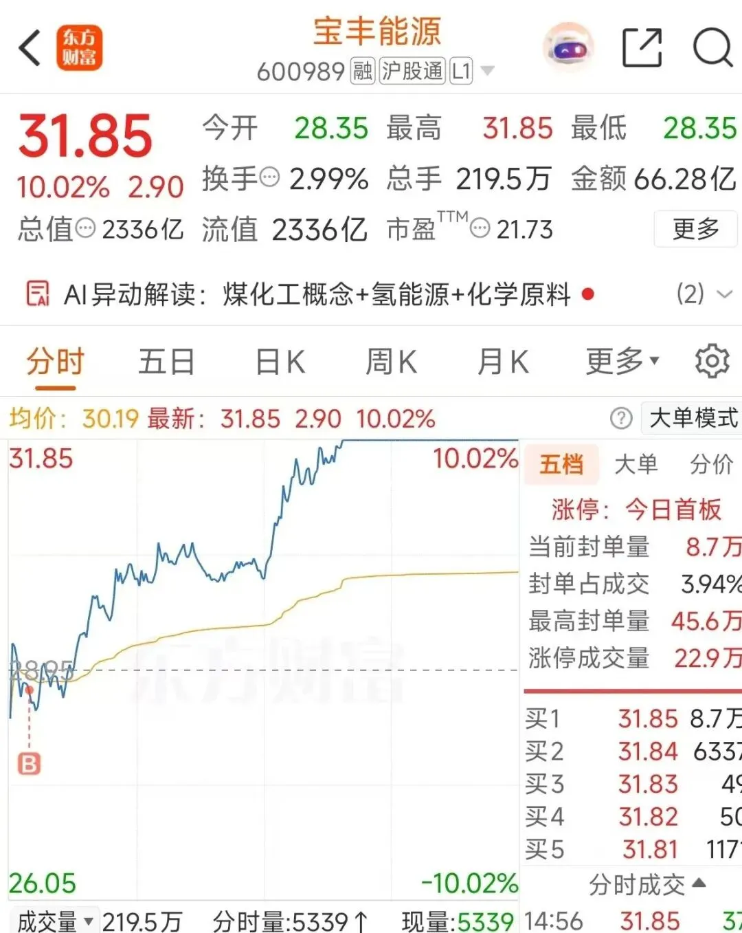 问了豆包,最后选定了宝丰能源,上午买了一点点观察仓,结果下午强势涨停!
