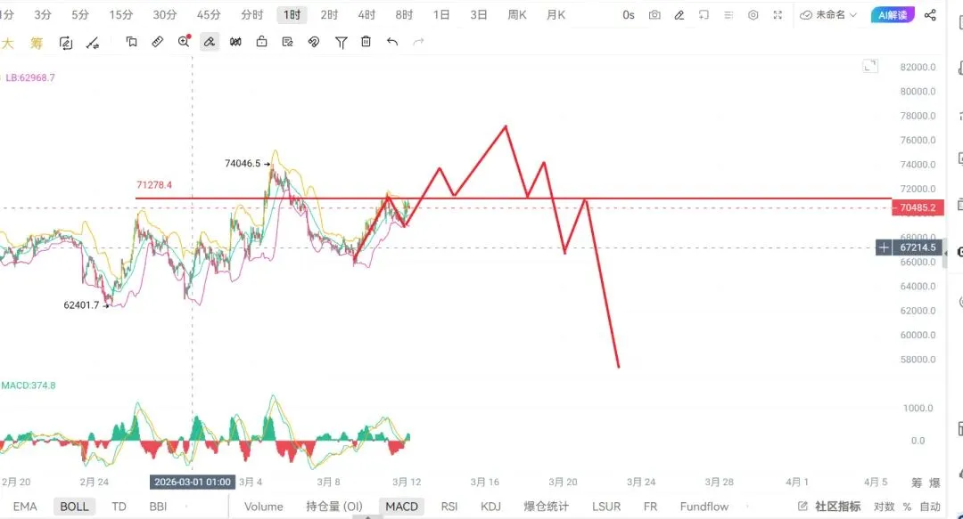 大饼小时级在 69212–70079 窄幅震荡一下午,多空对半,空仓先观望,不赌方向。支撑:69212 反复未破,跌破看 68210 下方压力:突破 70079 才看反弹 71240–71665右侧进场放量突破 70121 → 回踩跟多,看 71276–72300放量跌破 69272 反抽不收 → 跟空4小时收看跌吞没,给3根K线观察:不破箱体上沿 → 走4小时级别回调,盯量能,带止损。