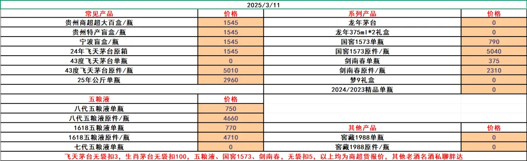酒水主要为飞天茅台以及五粮液,范围还包括:国窖1573、剑南春等。购买酒水需注意是否包盲盒,以及要注意不要买到海外版本等。