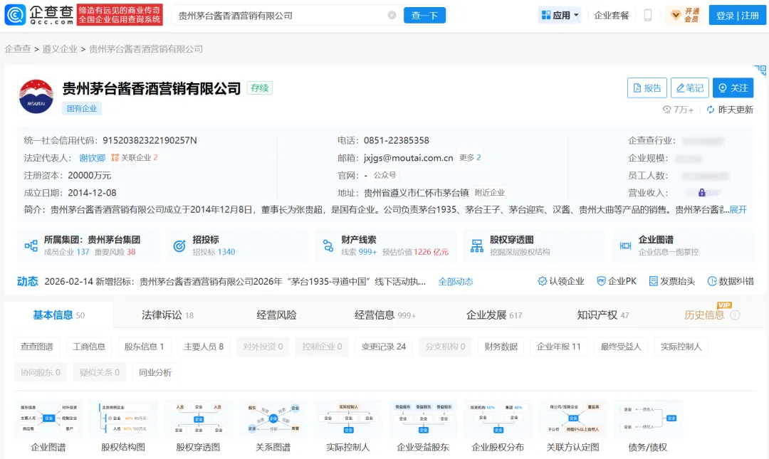 从天眼查获悉,近日,贵州茅台酱香酒营销有限公司发生工商变更,张贵超卸任法定代表人、董事长,由谢钦卿接任。在此任命前,谢钦卿兼任中国贵州茅台酒厂(集团)有限责任公司企业管理部主任以及贵州茅台酒股份有限公司职工董事、企业发展部部长,两个职位令其深度参与集团整体的战略规划、管理提升与上市公司治理,为后续发展打下基础。 该公司成立于2014年12月,注册资本2亿元人民币,经营范围包括茅台酒系列产品的销售,饮料、食品、包装材料的销售等。股东信息显示,该公司由贵州茅台(600519)全资持股。
