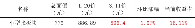 本期录得小型张目前总价格896.4元,比上期上涨约10元,环比涨幅1.07%,总收益率方面已经有16.11%的涨幅。