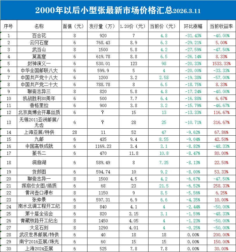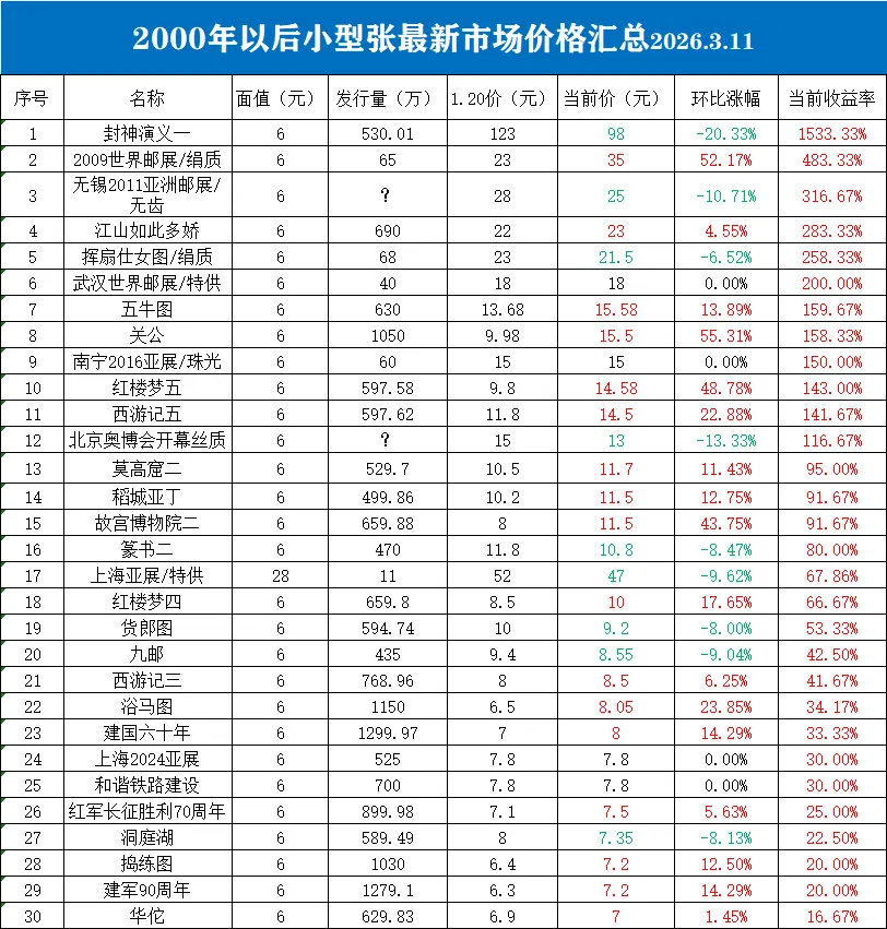 封神演义一小型张虽然出现回调,依然以15.3倍的涨幅在涨幅榜上一骑绝尘。牡丹丝绸小型张、无锡亚展无齿小型张、江山如此多娇小型张、挥扇仕女图绢质小型张、武汉邮展特供小型张涨幅从4.86倍至2倍,分列第二至第六位。前30强中,涨幅从1533%-16.67%,跨度很大,而翻番的品种一共只有12个,排在涨幅榜前列的以发行量相对少得多的短腿品种。在跌幅榜上,十八大小型张以环比跌幅19.38%、总收益率-57%的成绩”坐上“了跌幅榜榜首,南水北调、青藏铁路开工、大足石刻、滨海新区、辛亥革命、黄河水利水电工程小型张等6个品种跌幅都是50%,并排第二紧随其后。跌幅榜第30名抗战胜利70周年小型张虽然本期有3.12%的涨幅,但总收益率依然达到-45%。随着“评级刀”的持续进行,以小型张小版张为主,一些品种不断有庄家在收集筹码,价格也在不断上涨。本期环比涨幅排行中,三星堆小型张从3.1元涨到5.5元,涨幅77.42%,列榜单首位;关公小型张上期以22.73%的涨幅居首,本期再次取得55.31%的涨幅居次。包公和牡丹丝绸型张也取得超过50%的涨幅,分列第三、四名。本期跌幅榜上,一共只有27个品种出现下跌。百合花从7元跌到4.8元,跌幅31.43%,是唯一跌幅超过30%的品种。云冈石窟本期跌幅29.21%,位居第二。