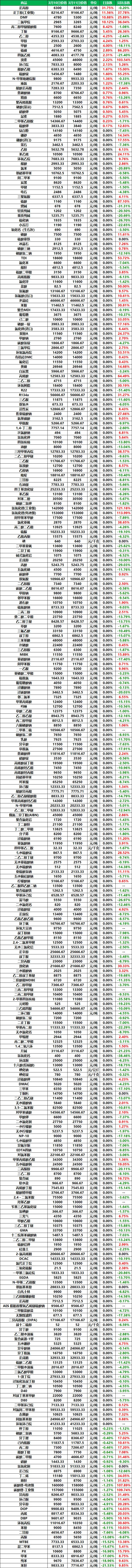 2026年3月11日大宗商品价格涨跌榜中化工板块环比上升的商品共26种,其中涨幅5%以上的商品共6种,占该板块被监测商品数的1.8%;涨幅前3的商品分别为正丙醇(31.75%)、正丁醇(工业级)(11.56%)、DMF(10.88%)。