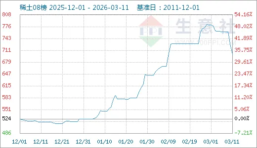 据生意社商品行情分析系统,近期国内轻稀土市场价格大幅回落,3月11日生意社稀土指数为700点,较上一日下降了30点,较周期内最高点1007点(2022-02-24)下降了30.49%,较2015年09月13日最低点271点上涨了158.30%。(注:周期指2011-12-01至今)