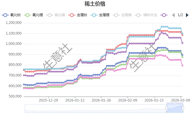 稀土作为上游原料,其价格走势高度依赖下游产业需求,而当前下游需求端的疲软表现,成为压制稀土行情的关键因素。前期稀土价格持续高位运行,大幅推高下游永磁材料、新能源汽车、风电、消费电子等领域的生产成本,下游企业盈利空间被挤压,普遍放缓备货节奏,主动规避高价原料风险,转向按需采购、轻库存运营模式,对稀土原料的采购需求明显降温。叠加3月正值传统消费淡季,新能源汽车终端销量增速放缓、风电装机节奏进入调整期、消费电子市场需求未见明显回暖,终端订单传导偏弱,磁材企业开工率未达预期,对稀土原料的消化能力持续不足。更值得关注的是,部分下游领域出现原料替代技术,铈铁合金等替代产品逐步应用,进一步缩减了高端稀土原料的需求份额,需求端整体表现乏力,难以对高位稀土价格形成有效支撑。