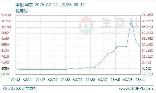 3月10日,华东苯酚价格回落至9000元/吨;3月11日,价格进一步跌至8800元/吨,短短两日累计跌幅超2000元/吨,前期积累的涨幅被大幅吞噬。