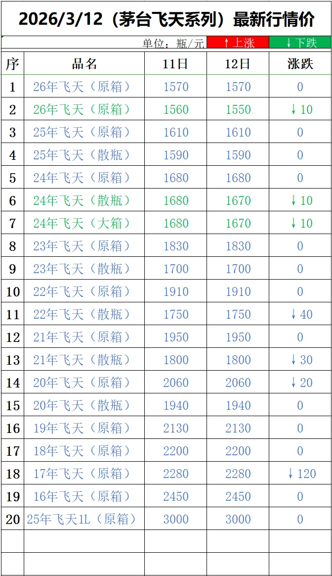 普通飞天茅台酒行情见下表
