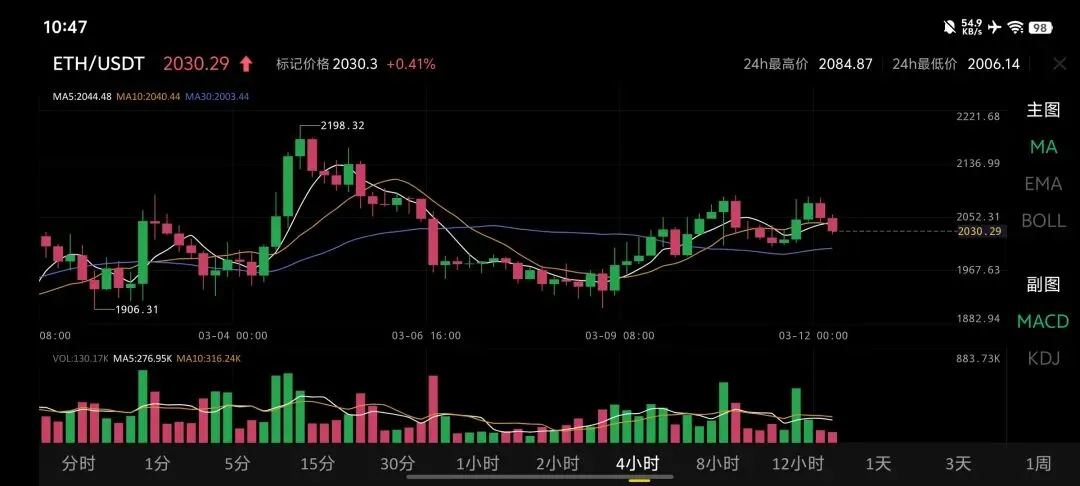 2026年3月12日 (ETH) 在4小时级别的行情分析。当前ETH价格报2030.29美元,整体走势相较于比特币略显弱势,处于关键支撑区域博弈: