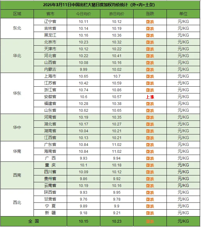 2026年3月11日,中国主流市场出栏外三元、内三元及土杂商品大猪加权日均价较昨日价格偏弱,全国生猪出栏加权日均价10.15每公斤,较昨日价格下跌0.76%。当前供应端偏宽松,前期压栏大猪、规模场出栏增加叠加冻品库存偏高,市场供给充足;需求端处于节后淡季,消费偏弱、屠企持续压价收购,养殖端亏损扩大。预计近期仍低位震荡。今日全国外三元、内三元及土杂猪均价如下:1) 主流市场外三元大猪全国销售均10.27元每公斤,较昨天价格下跌0.68%;2)主流市场内三元大猪全国销售均价9.87元每公斤,较昨天价格下跌1.05%;3)主流市场土杂大猪全国销售均价9.50元每公斤,较昨天价格下跌0.77%。