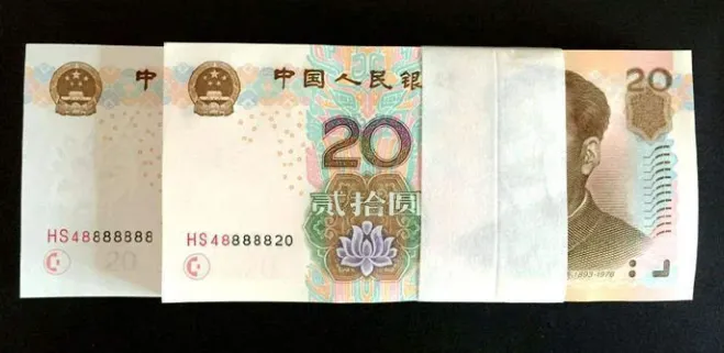 2005年版二十元纸币,二冠版本,尾数七个8相连但带有数字4,全新品相的参考价格约为两千六百元。