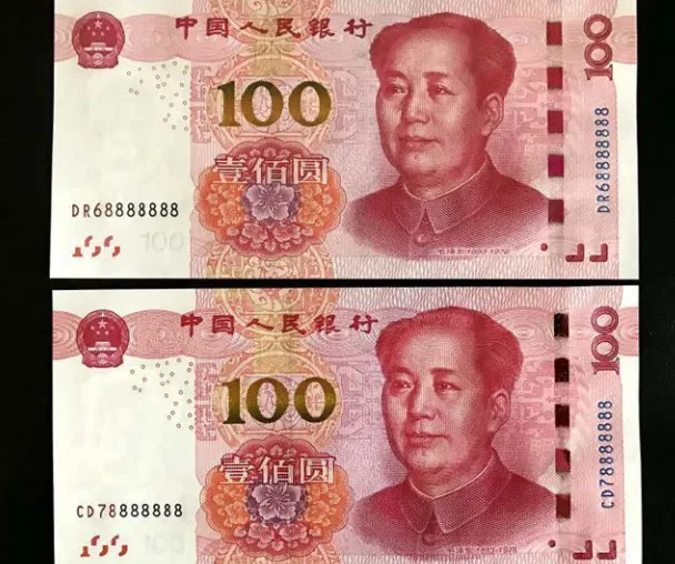 2015年版百元纸币,俗称"土豪金",尾数七个8相连且前面带有数字6,全新品相的参考价格约为三千六百元。