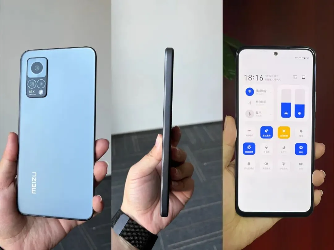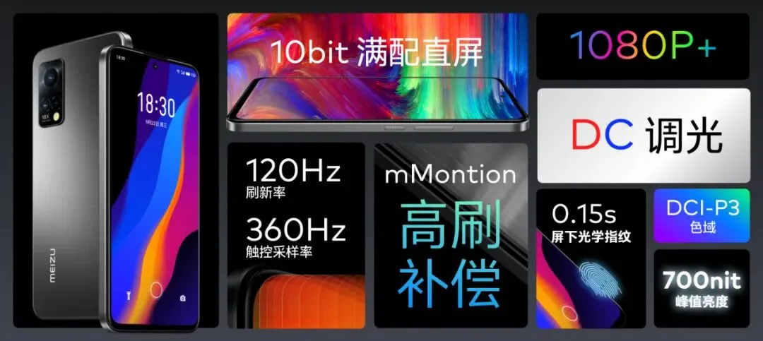 主要参数上,魅族18X有:6.67英寸FHD+分辨率20:9的OLED直屏屏,120Hz自适应刷新率,360Hz触控采样率,10bit屏,支持DC调光,光学屏下指纹,直角中框+2.5D AG玻璃后盖,机身三围165.1*76.35*厚7.99mm,重189g。