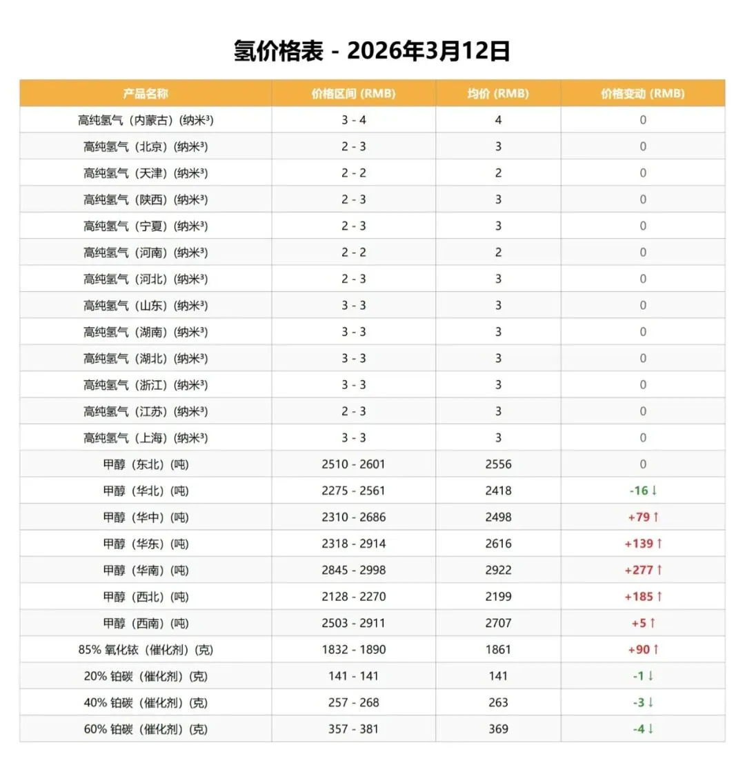 今日高纯氢气价格整体保持稳定。甲醇市场普遍上涨,除华北价格微降、东北平稳外,华中、华东、华南、西北、西南地区价格均有不同幅度上调,其中华南涨幅显著。催化剂市场出现分化,氧化铱价格大幅上涨,而各类铂碳产品价格则普遍下跌。