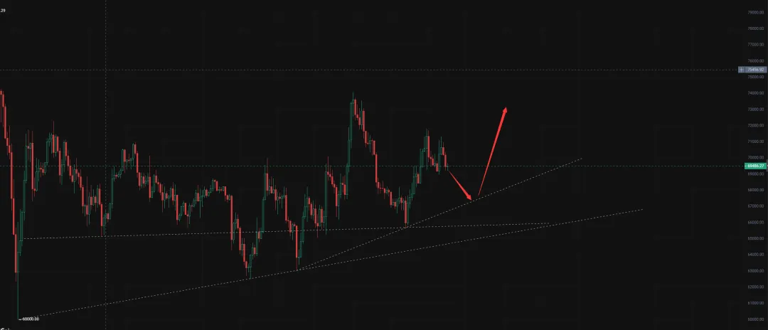 当前 BTC 支撑位在 68 附近,需防范回踩插针至 67–68 区间,企稳后仍有望再度反弹。后续整体思路不变,依旧以看涨为主,不建议轻易做空,逢低布局多单即可。上方目标依旧看 76–80 区间,近期大概率以震荡调整为主,耐心等待低多机会。