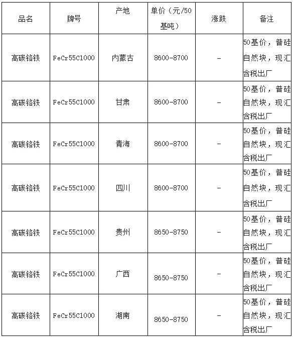 品名 | 牌号 | 产地 | 单价(万元/50基吨) | 涨跌 | 备注 |