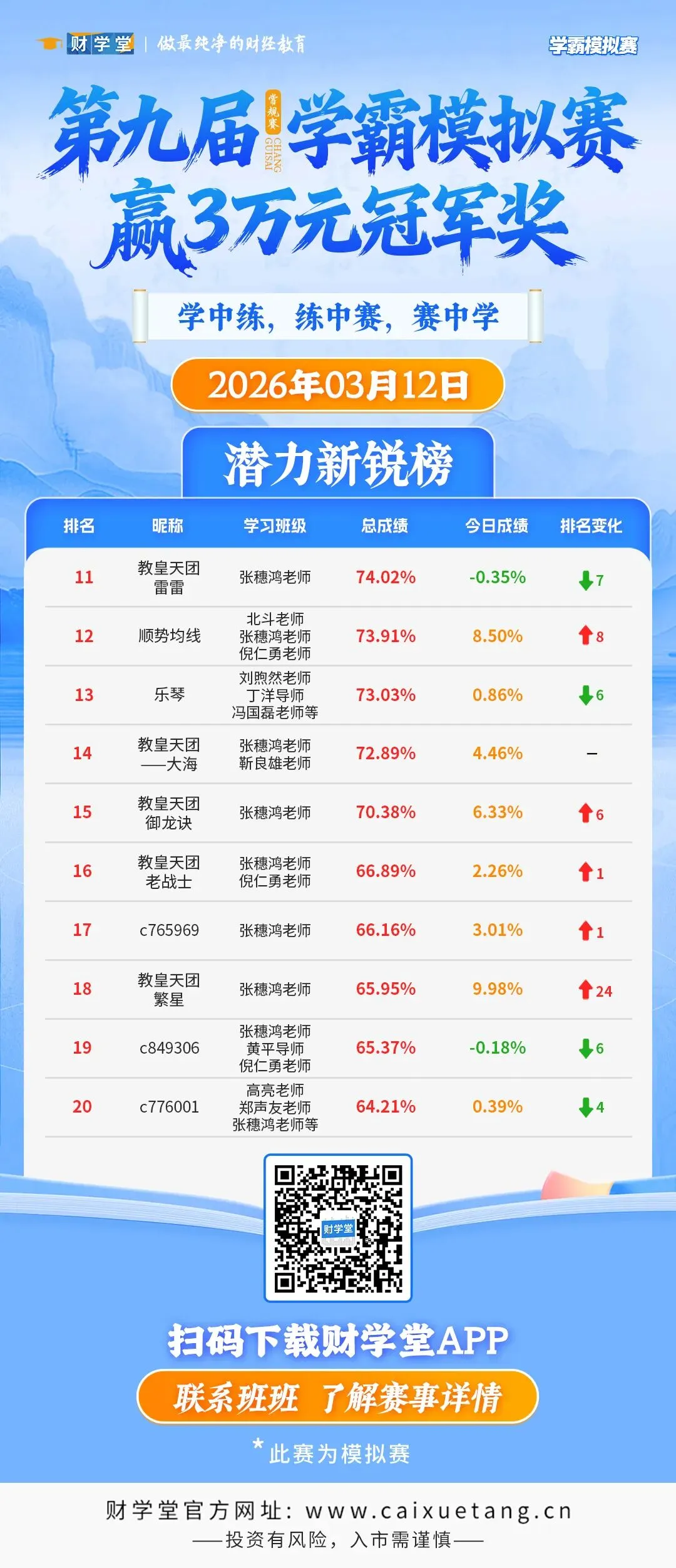 还没参与的同学也可以一起加入进来试试,打开【财学堂App】→ 首页【学习园地】→【模拟训练】立即报名参赛,别再只看热闹,直接进来,和大家一起跑完整场!