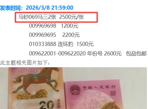 2026马年纪念钞靓号溢价飙升,069、068等组合散张喊价上千元;