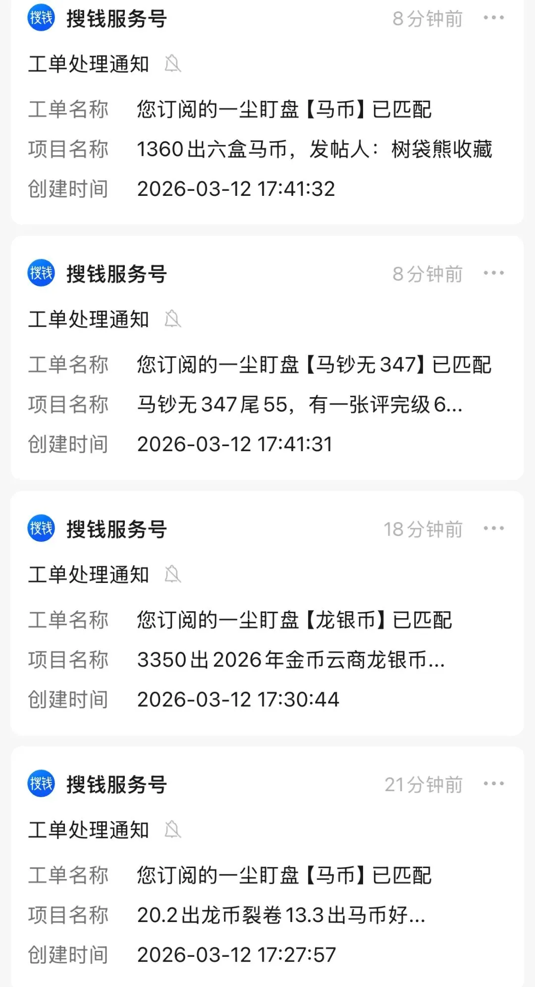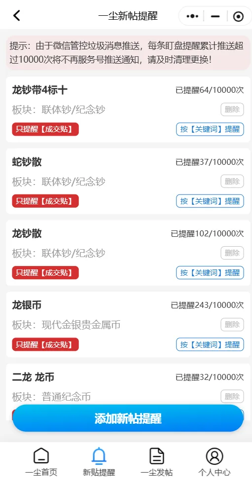 可以自由添加关注品种(比如“马钞/龙钞/龙银币”),新帖、成交帖秒推送,即时提醒。