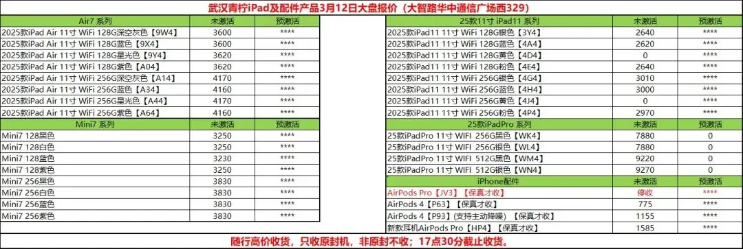 苹果手机平板到货邮寄武汉地址:湖北省武汉市江岸区大智路华中通信广场西329室W329