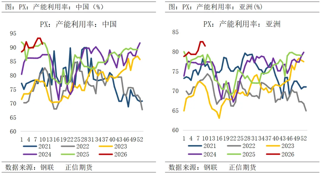 战争期间因上游原料供应稳定性担忧,国内部分PX装置进行了预防性降负措施,目前国内PX总负荷降至91.16%(产能4613万吨),后续关注中东局势特别是霍尔木兹海峡通行情况。