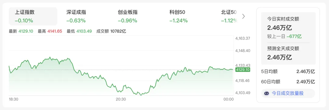 收盘看了一眼数据:沪指跌0.1%,深成指跌0.63%,创业板指跌0.96%。全市场超3800只个股下跌,成交额2.44万亿,比昨天缩了665亿。