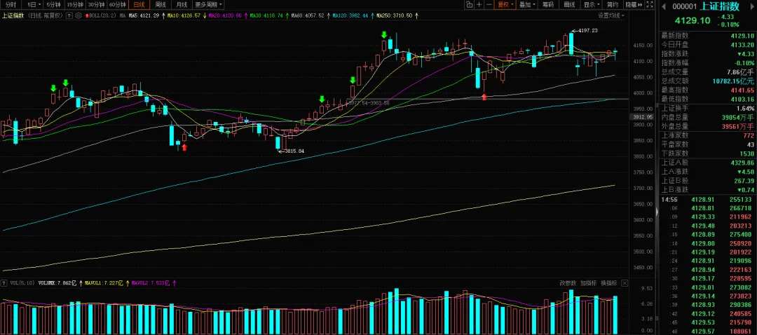 盘面上,1494家上涨,3893家个股下跌,64家个股涨停,6家个股跌停。
